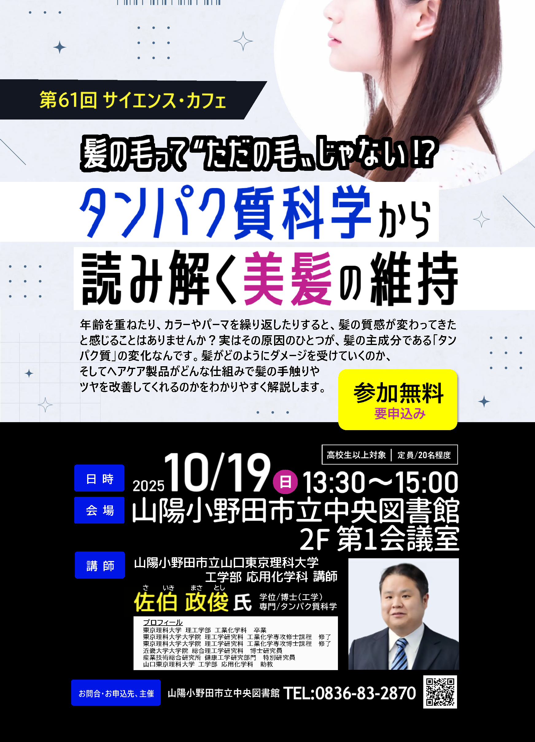 2025年10月19日(日)山陽小野田市立中央図書館において、第61回サイエンス・カフェが開催されます。